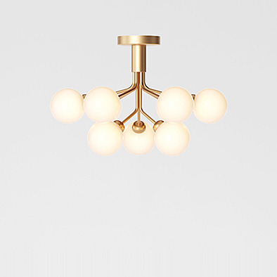 エピエレスは、幼い頃の夏の思い出、祖父のコッテージの側に咲くセリの野草や北欧の長い夏の夕暮れ、あたりに広がる美しい自然をインスピレーションに生まれました。吹きガラスのグローブを構成する灯具は花のつぼみを支える茎をイメージにデザイン。ネジや結合部を見せないディテールにまでこだわった可憐でいてエレガントなシャンデリアです。