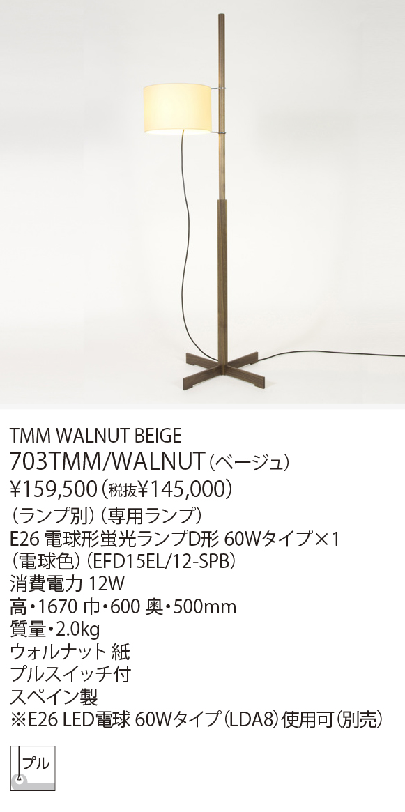 1961年にミゲル・ミラによりデザインされたTMMは、クロスのベースと角型の支柱にシンプルなシェードを組み合わせ、シェードポジションはラバー製のストッパーで自在とし、オンオフさえケーブルによるプルスイッチというミニマルな構造を持ちます。