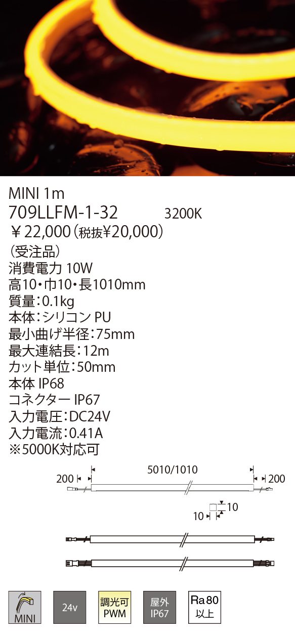 曲げ加工のできる屋外使用が可能なLEDラインモジュールです。LEDのドットを感じさせない連続した光が特徴です。単色タイプは5つの色温度からお選びいただけます。調光調色タイプは調光器との組合せで2700K〜6500Kの色温度が選べます。RGBタイプは調光器との組合せで任意のカラー演出が可能です。