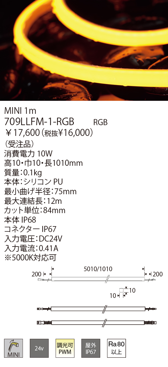 曲げ加工のできる屋外使用が可能なLEDラインモジュールです。LEDのドットを感じさせない連続した光が特徴です。単色タイプは5つの色温度からお選びいただけます。調光調色タイプは調光器との組合せで2700K〜6000Kの色温度が選べます。RGBタイプは調光器との組合せで任意のカラー演出が可能です。