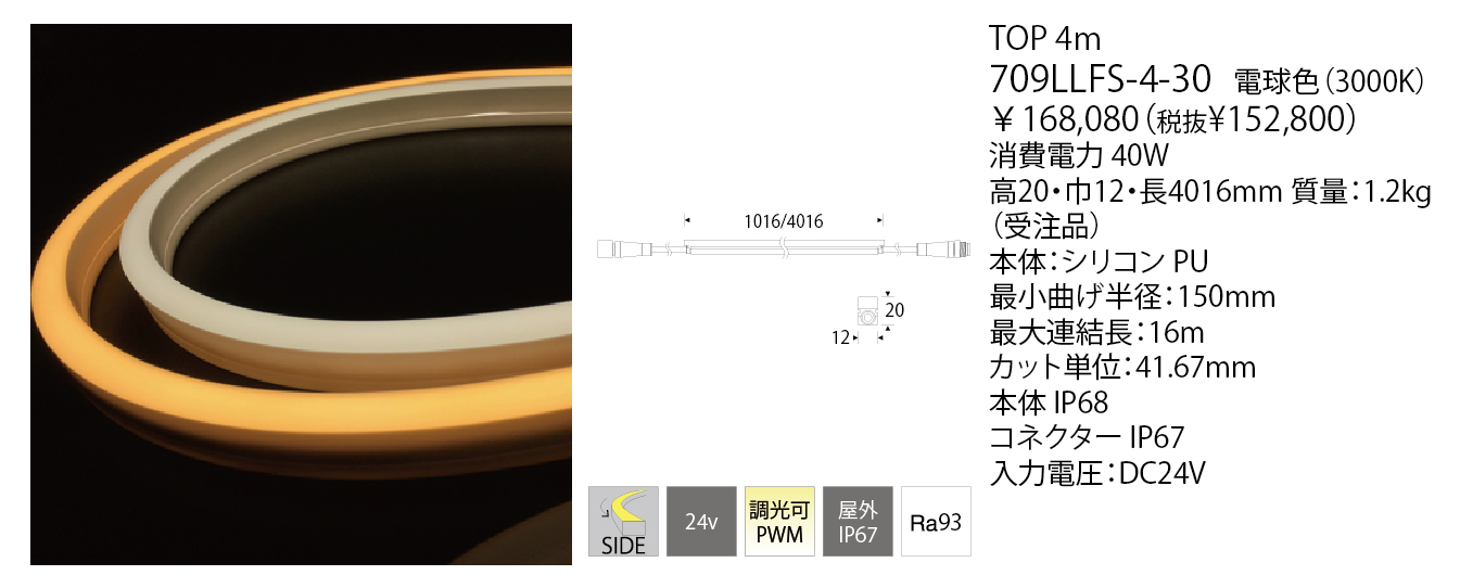 曲げ加工のできる屋外使用が可能なLEDラインモジュールです。LEDのドットを感じさせない連続した光が特徴です。SIDEは断面の上面の1面が発光し、横方向に曲げ加工が可能です。