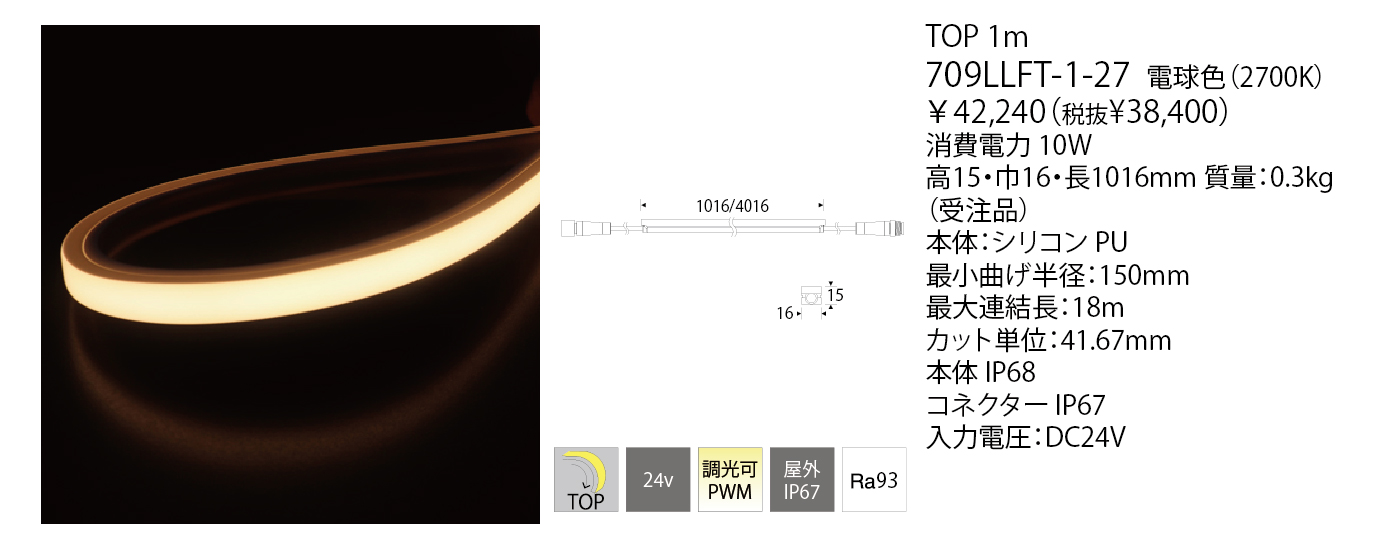 曲げ加工のできる屋外使用が可能なLEDラインモジュールです。LEDのドットを感じさせない連続した光が特徴です。TOPは断面の上面の1面が発光し、縦方向に曲げ加工が可能です。