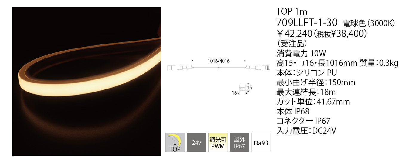 曲げ加工のできる屋外使用が可能なLEDラインモジュールです。LEDのドットを感じさせない連続した光が特徴です。TOPは断面の上面の1面が発光し、縦方向に曲げ加工が可能です。
