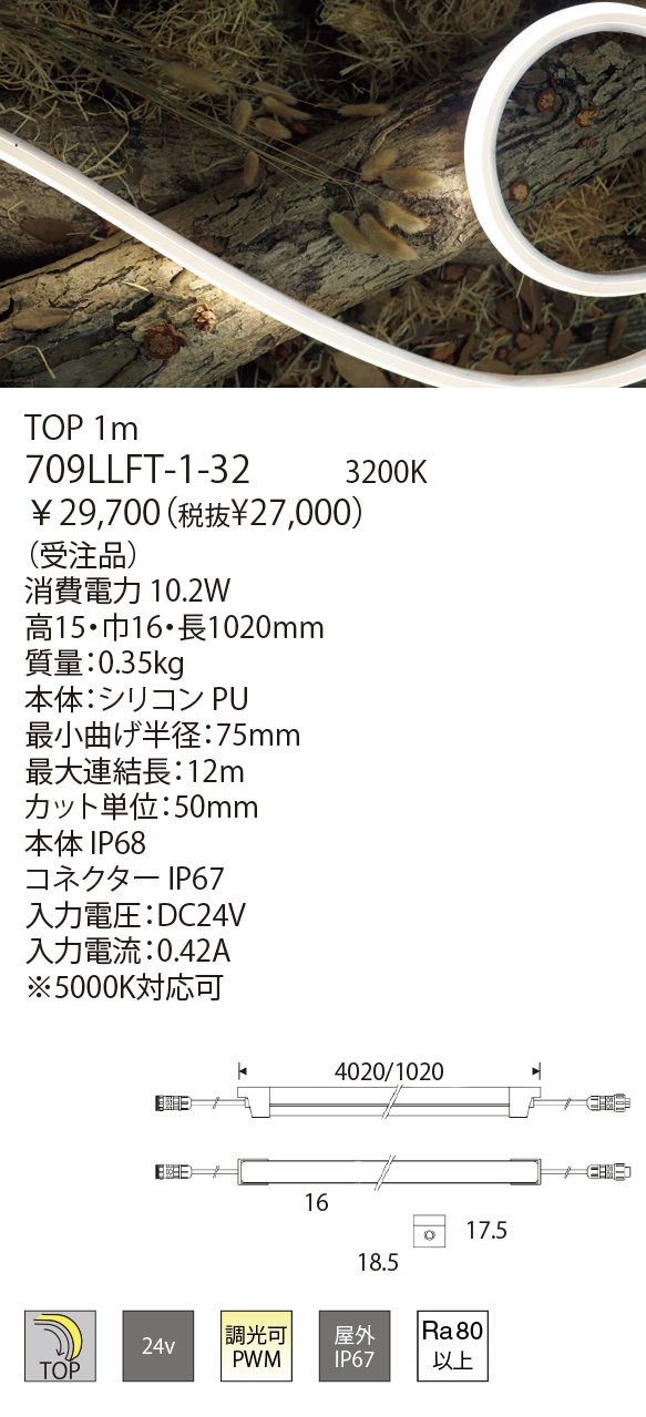 曲げ加工のできる屋外使用が可能なLEDラインモジュールです。LEDのドットを感じさせない連続した光が特徴です。単色タイプは5つの色温度からお選びいただけます。調光調色タイプは調光器との組合せで2700K〜6500Kの色温度が選べます。RGBタイプは調光器との組合せで任意のカラー演出が可能です。