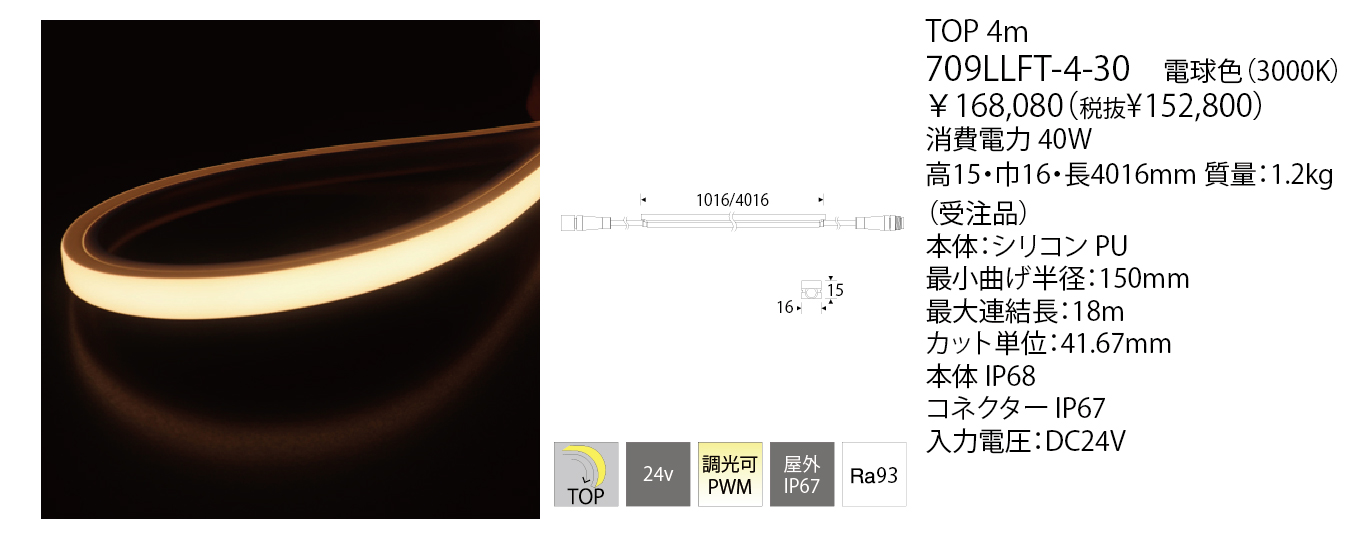 曲げ加工のできる屋外使用が可能なLEDラインモジュールです。LEDのドットを感じさせない連続した光が特徴です。TOPは断面の上面の1面が発光し、縦方向に曲げ加工が可能です。