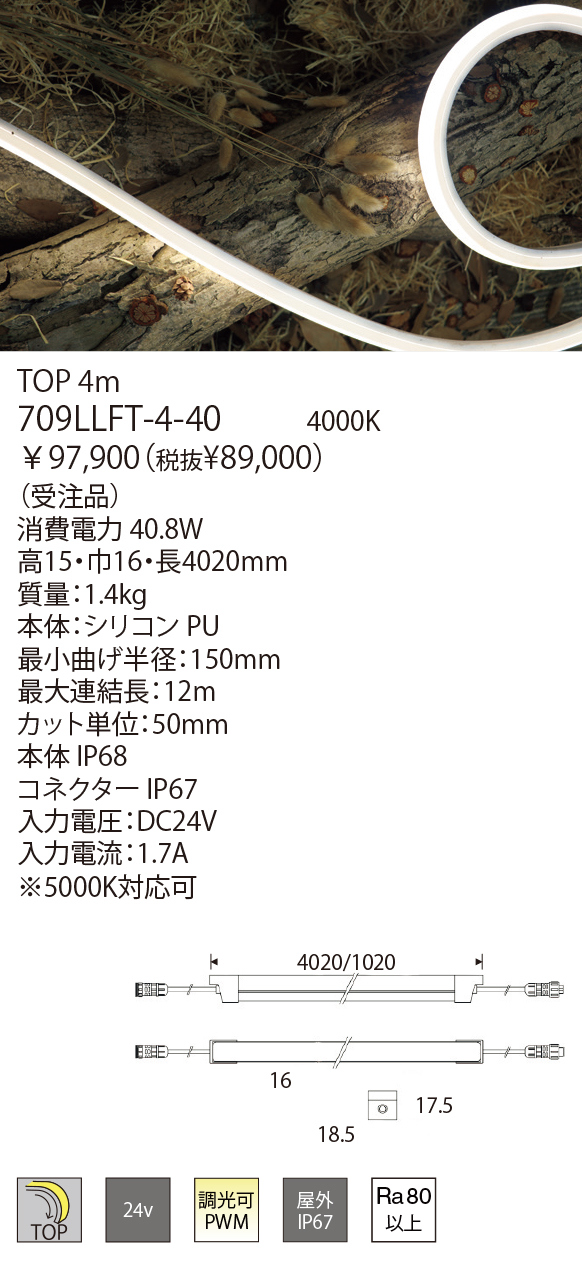 曲げ加工のできる屋外使用が可能なLEDラインモジュールです。LEDのドットを感じさせない連続した光が特徴です。単色タイプは5つの色温度からお選びいただけます。調光調色タイプは調光器との組合せで2700K〜6500Kの色温度が選べます。RGBタイプは調光器との組合せで任意のカラー演出が可能です。