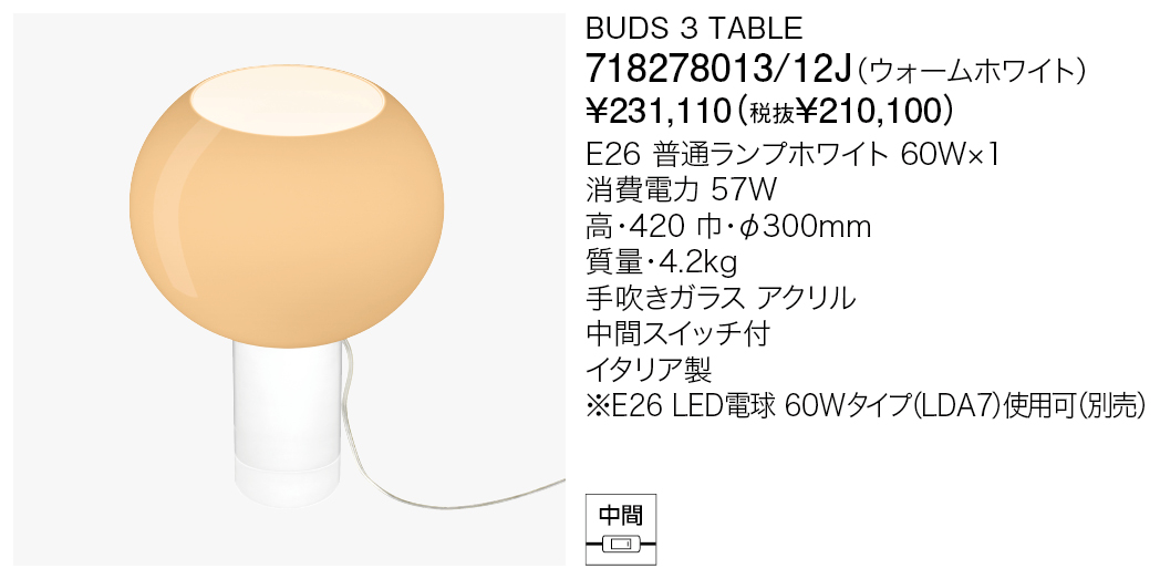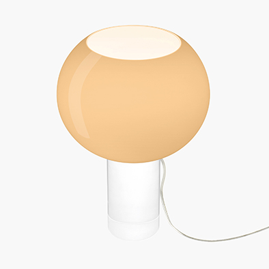 花のつぼみをモチーフにデザインされたバッズ。3つのフォルムとカラーの展開があるシェードは、ハンドクラフトでつくられた5層の吹きガラスでできており、素材の美しさが最大限生かされています。シェードの内側には黄色味を帯びた仕上げが施してあり、点灯するとより一層あたたかみのある表情を見せます。スタンドの支柱は透明な無垢のアクリル製。ガラスが浮遊しているように見え重力の存在を忘れます。
