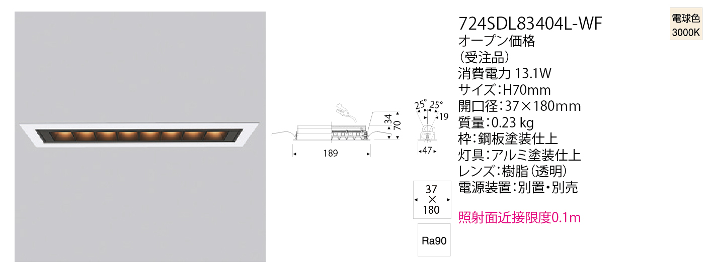 トリム巾47mmで長さが115mm/189mm/263mmの3タイプあり、左右にチルト可能です。16°/24°/37°の3配光、電球色2700K/電球色3000Kの色温度からお選びください。