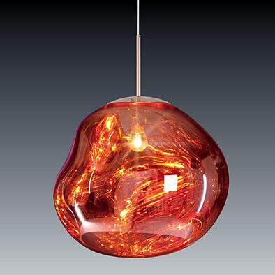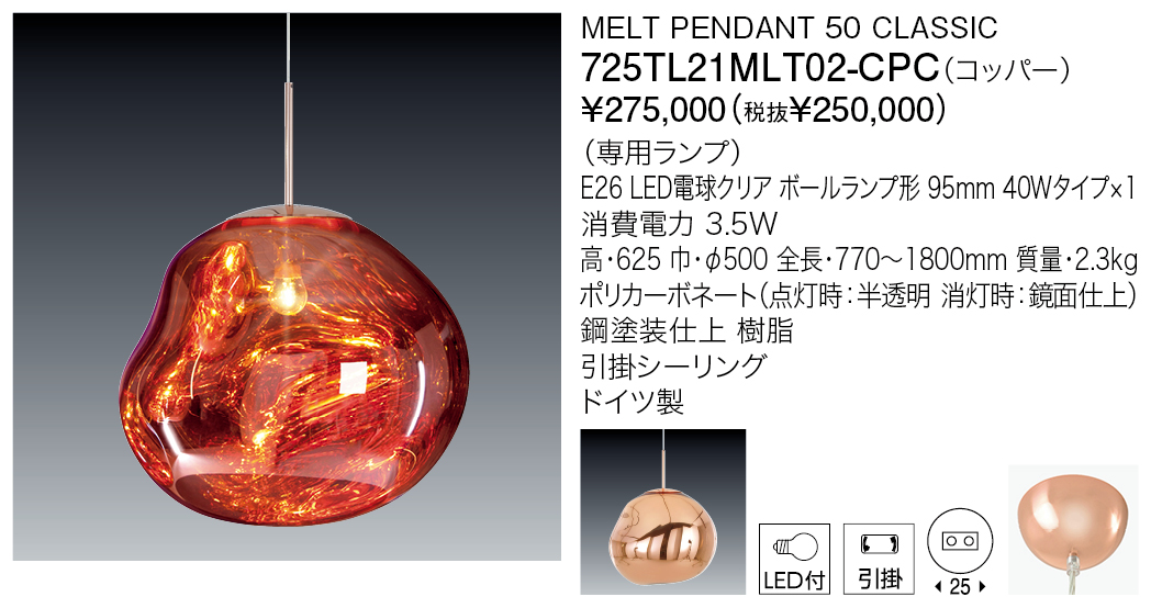 スウェーデンのデザイングループ「Front」とのコラボレートにより生まれたメルトは、Tom Dixonの代表作の一つでもある「COPPER」に「ひねり」を加えた吹きガラスのような形状が特徴的なポリカーボネート製の照明です。消灯時は鏡面状に見える金属のような塊が、点灯するとまるで固体が溶け出し液体状に変化しているかのような錯覚を与え、独特な光を放ちます。電球タイプのメルトクラシックは、複雑な光の軌跡が空間を華やかに演出します。