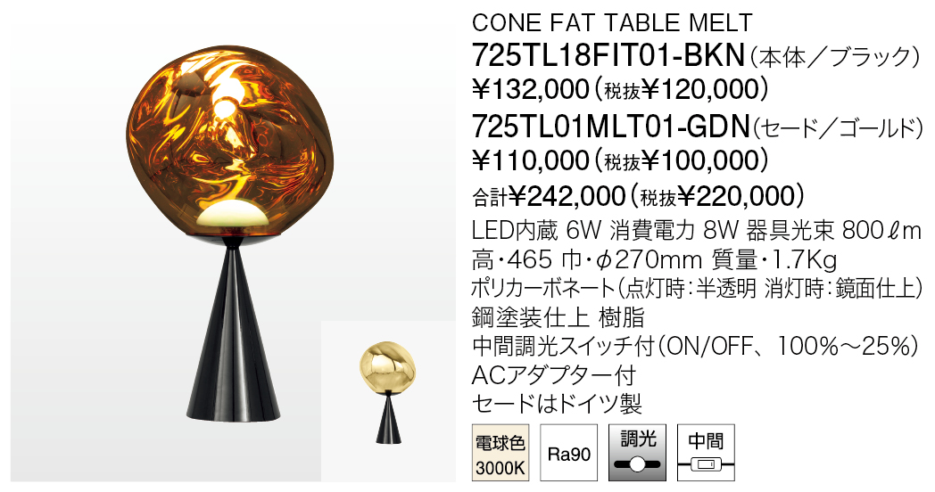 円錐形の灯具本体と、トム・ディクソンを代表する16種類のシェードとを組み合わせて使えるテーブル/フロアライト。照明器具に期待される機能や意匠性を実現するために、無駄な要素は可能な限り削ぎ落とし、このミニマルなデザインにたどり着きました。シンプルなカタチにこだわり続けるデザイナー トム・ディクソンらしい商品です。メルトのシェードの中は特殊な真空蒸着によって塗装され、シェード上部から底部にかけて塗装の濃度を段階的に変えることで、点灯時には物体が溶けるような視覚効果を生み出し、消灯すると空中を漂う鏡面のオブジェへと変化します。