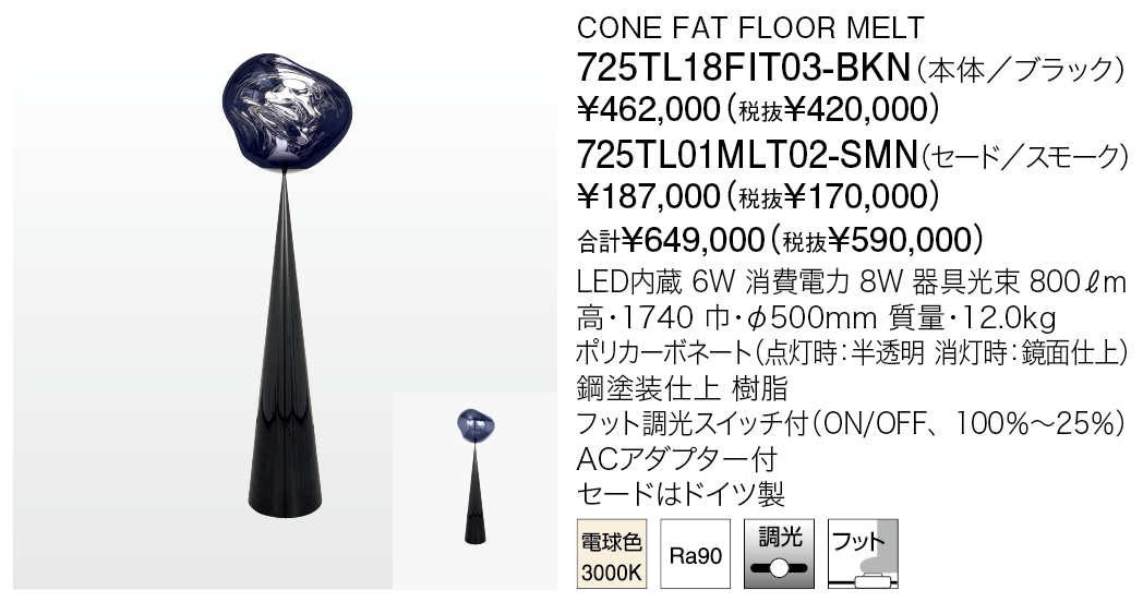 円錐形の灯具本体と、トム・ディクソンを代表する16種類のシェードとを組み合わせて使えるテーブル/フロアライト。照明器具に期待される機能や意匠性を実現するために、無駄な要素は可能な限り削ぎ落とし、このミニマルなデザインにたどり着きました。シンプルなカタチにこだわり続けるデザイナー トム・ディクソンらしい商品です。メルトのシェードの中は特殊な真空蒸着によって塗装され、シェード上部から底部にかけて塗装の濃度を段階的に変えることで、点灯時には物体が溶けるような視覚効果を生み出し、消灯すると空中を漂う鏡面のオブジェへと変化します。