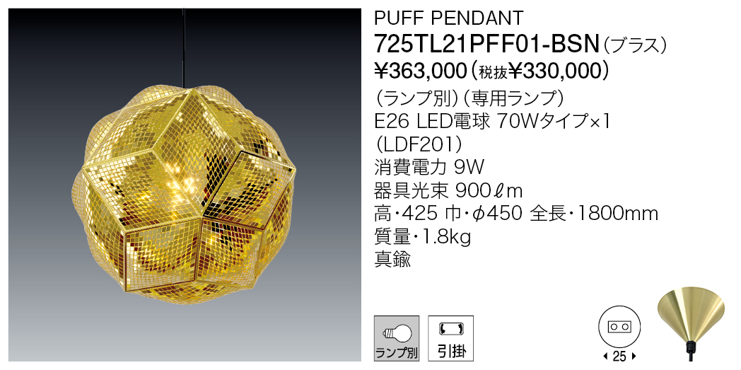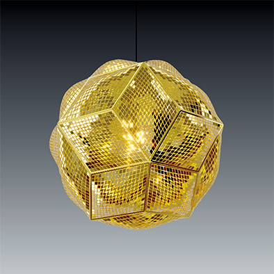 パフは、30枚の立体的な金属パネルで構成した多面体のオブジェ。パネルに施された無数の切込みにより内部で光の反射が起こり、ディスコボールのような輝きを放ちます。
