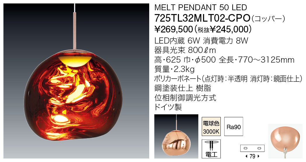 スウェーデンのデザイングループ「Front」とのコラボレートにより生まれたメルトは、Tom Dixonの代表作の一つでもある「COPPER」に「ひねり」を加えた吹きガラスのような形状が特徴的なポリカーボネート製の照明です。消灯時は鏡面状に見える金属のような塊が、点灯するとまるで固体が溶け出し液体状に変化しているかのような錯覚を与え、独特な光を放ちます。内蔵LEDを採用したメルトは、電球タイプと比較し、シェード全体に光が行き渡って溶け落ちるような視覚効果を生み出します。
