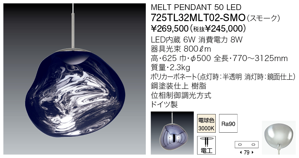 スウェーデンのデザイングループ「Front」とのコラボレートにより生まれたメルトは、Tom Dixonの代表作の一つでもある「COPPER」に「ひねり」を加えた吹きガラスのような形状が特徴的なポリカーボネート製の照明です。消灯時は鏡面状に見える金属のような塊が、点灯するとまるで固体が溶け出し液体状に変化しているかのような錯覚を与え、独特な光を放ちます。内蔵LEDを採用したメルトは、電球タイプと比較し、シェード全体に光が行き渡って溶け落ちるような視覚効果を生み出します。