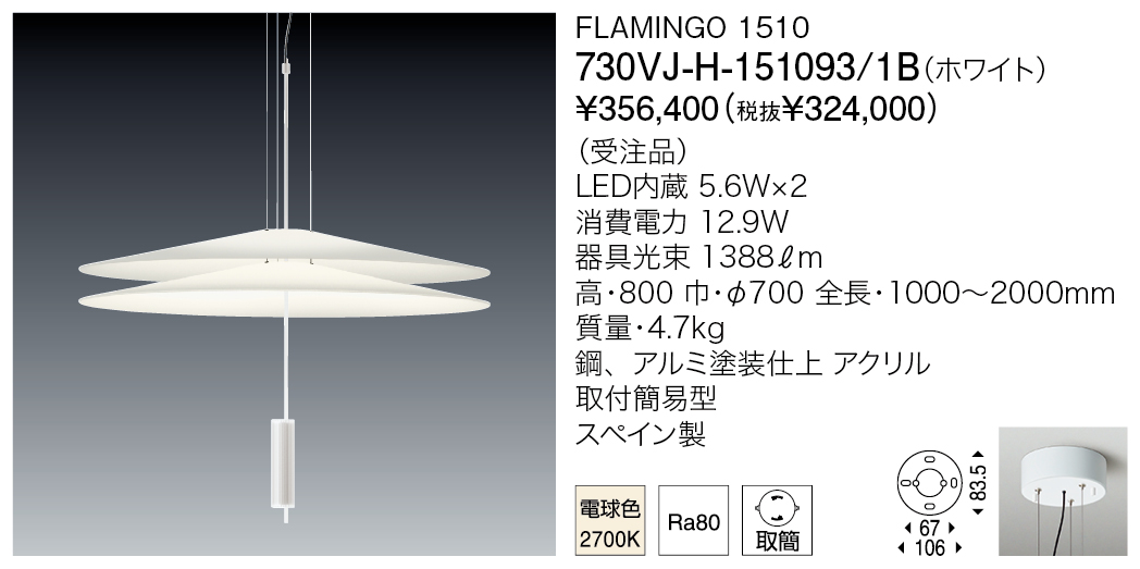 フラミンゴはセードで光源を覆うという照明の構造原理を疑い、光源とセードをあえて分離した革新的なペンダントライト。セードの中心を貫く支柱に配されたLEDは器具直下にスポットライトの明かりを届け、周囲にはセードが反射するやわらかな光を届けます。その姿は静かに水面に舞い降りるフラミンゴを紡彿とさせます。