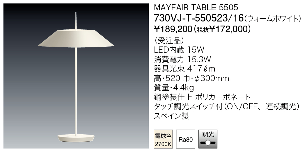古典的な形状のランプを現代的な素材や質感・LED光源を用いて革新的にアプローチしたのがメイフェアです。セード内側の凹凸感による陰影や、綿密に設計された光源からの配光、タッチセンサー式調光スイッチによる滑らかな操作感などはクセの無い形状の中に技術や想いが詰まったVIBIAのデザインへのこだわりを強く感じ、空間をワンランク上質に仕上げます。
