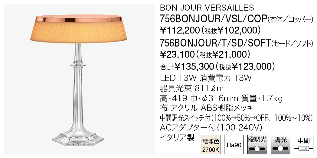 ボンジュール・ヴェルサイユは、伝統的なクリスタルブランド バカラのアイコンであるキャンドルホルダー「ヴェルサイユ」と、フロス「ボンジュール」のコラボレーションです。メゾンバカラの古典的で精密に彫刻された「ヴェルサイユ」をアクリルの素材で施した「ボンジュール・ヴェルサイユ」は、二つのサイズをラインアップ。光り輝くボディに暖かく均一なLED光源が美しく照らす、最新技術と職人技が融合したライティングコレクションの誕生です。