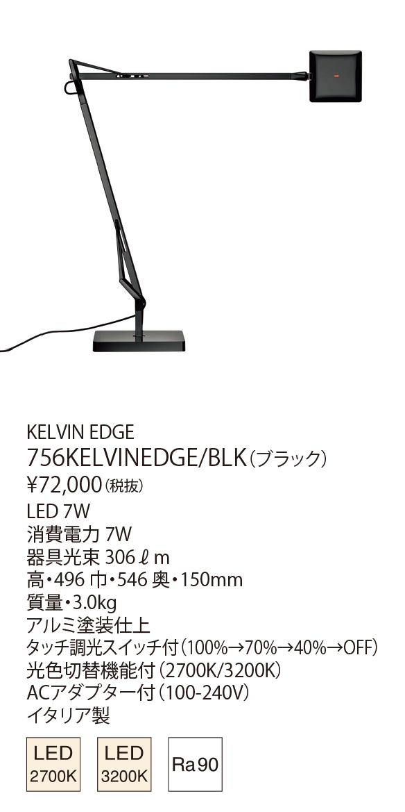 ケルビンは、イタリアを代表する建築家でデザイナーのアントニオ・チッテリオによるLEDタスクライト。軽快なアームにマッチしたスリムな灯具の採用で、先進的なフォルムを実現しています。ミニケルビンは高級感のあるクロームメッキが施され、小さいながらも存在感が際立ちます。デスクだけでなくベッドサイドの読書灯としてなど、多様な空間・用途で活躍します。