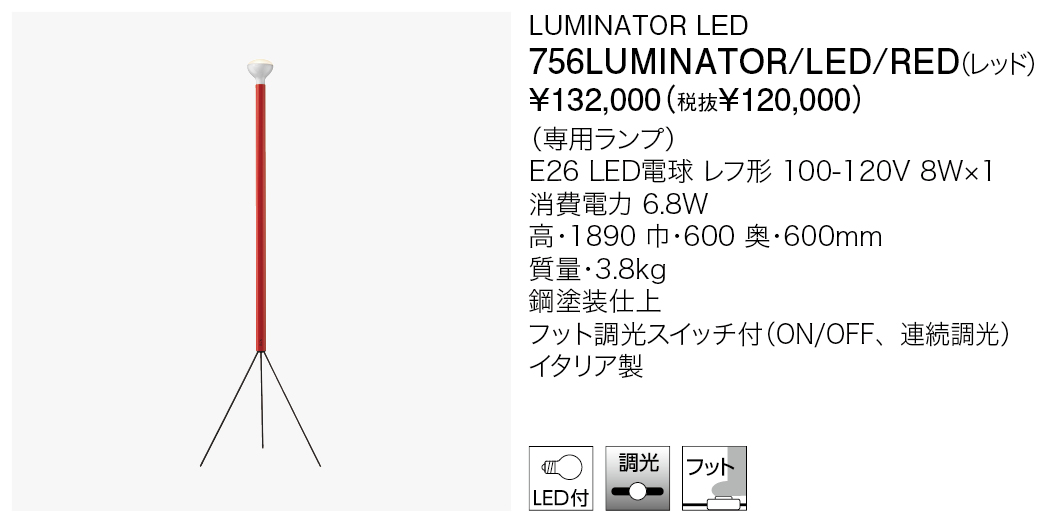 ルミナトールは1954年、アッキーレ&ピエール・ジャコモ・カスティリオーニによってデザインされたフロアスタンド。翌年にはデザイン賞として最も権威あるコンパッソ・ドーロ賞を受賞しています。支柱と三脚のみで構成され、レフランプさえ意匠に思えてしまうほどミニマルなフォルムは時代に左右されることが無く、名作と呼ばれるに相応しい潔さ。