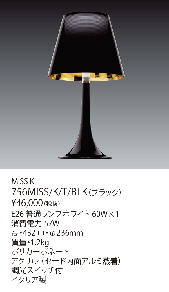 ミス Kは、アクリルにアルミ蒸着したセードと内側の乳白セードがクールなデザインです。調光スイッチによりディフューザーを通した光がセードの表面を美しく変化させ、点灯時と消灯時にはまったく違った表情が楽しめます。