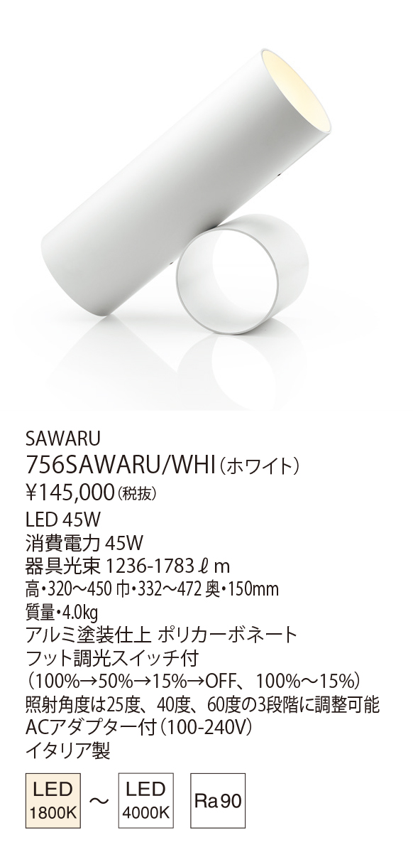 サワルは、2つのシリンダーで構成されているシンプルな照明器具。ベースに取り付けられたピンを差し込むことによって25度、40度、60度の3段階に光の照射角度を変更することができます。不要な要素を削ぎ落としたシンプルなフォルムは、使う人の用途にあわせて利用できる多様性を生み出しています。