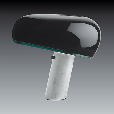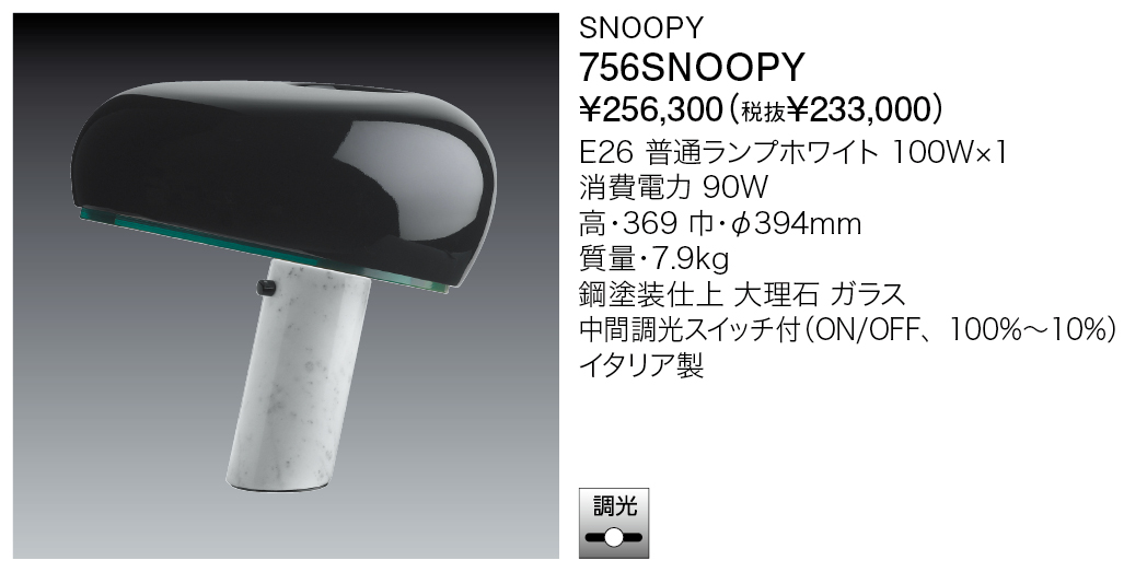 スヌーピーは、横からのフォルムがキャラクターに似ている事から名前が付けられました。光の広がりを計算し大理石の支柱を後ろに傾斜。大きなシェードとのバランスが絶妙です。
