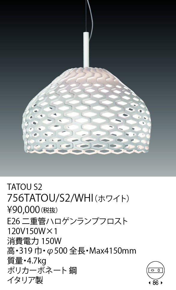 TATOU S2(生産完了品) 756TATOU/S2/WHI オープン価格 生産完了品 Main Spec Download データダウンロード チェックしたファイルをダウンロードします。 チェック全てをダウンロード 全て選択 小組画像 仕様図 取扱説明書 姿図1 姿図2 配光データ IESデータ 商品画像 3D CAD REVITデータ