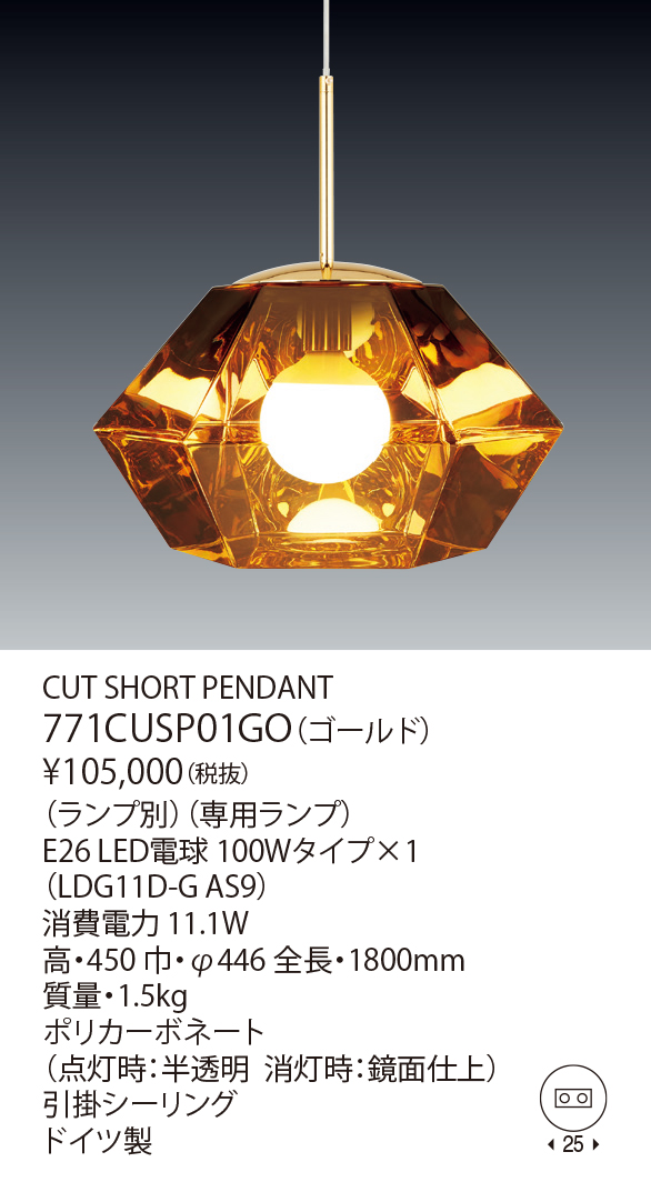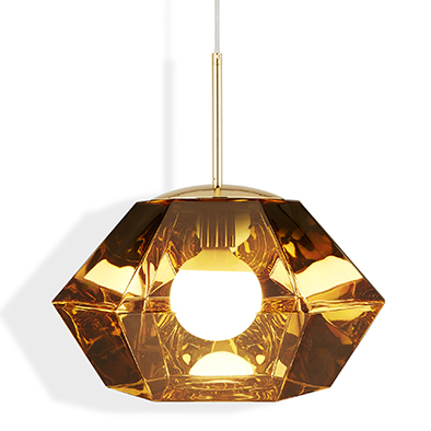 カットは、2つの六角錐台で構成された多面体のペンダント。ポリカーボネート製のシェードに鏡面仕上げを施し、点灯時には万華鏡のように光がきらめき消灯時には鏡面状のオブジェとなります。トム・ディクソンが追い続けている“反射と透過”という光による視覚効果への探求が活かされた作品です。