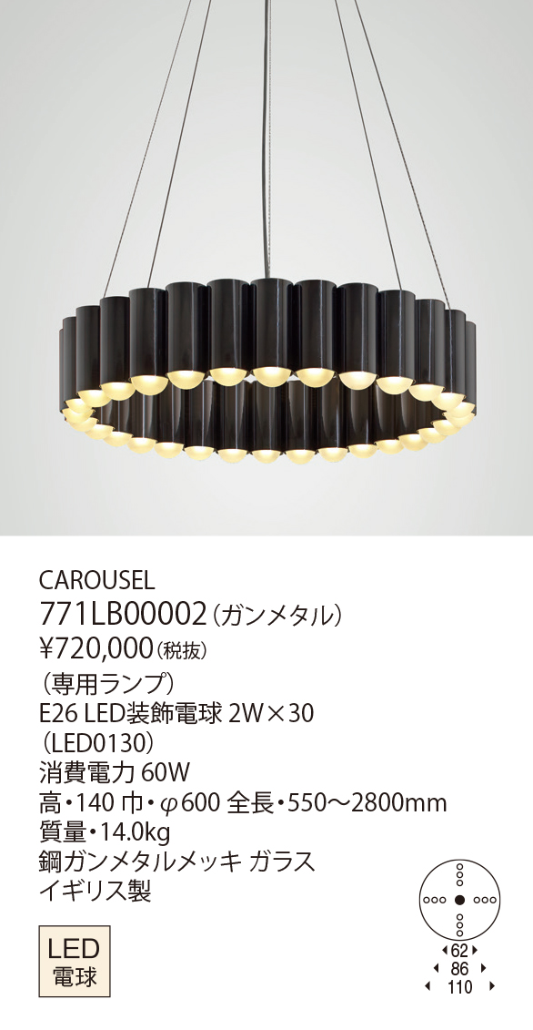 カルーセルは、英国でよくみられる移動遊園地のメリーゴーランドの形状からヒントを得てデザインされました。重厚感があり、空間に存在感を放ちながらも、上質でモダンな印象に変えるシャンデリアです。
