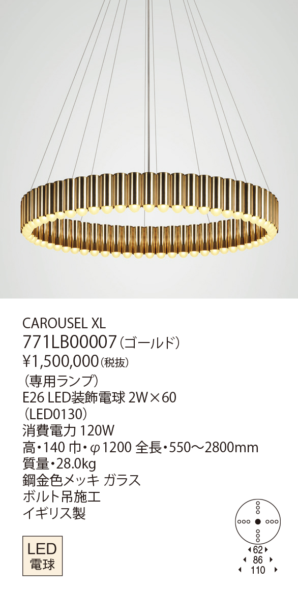 カルーセルは、英国でよくみられる移動遊園地のメリーゴーランドの形状からヒントを得てデザインされました。重厚感があり、空間に存在感を放ちながらも、上質でモダンな印象に変えるシャンデリアです。