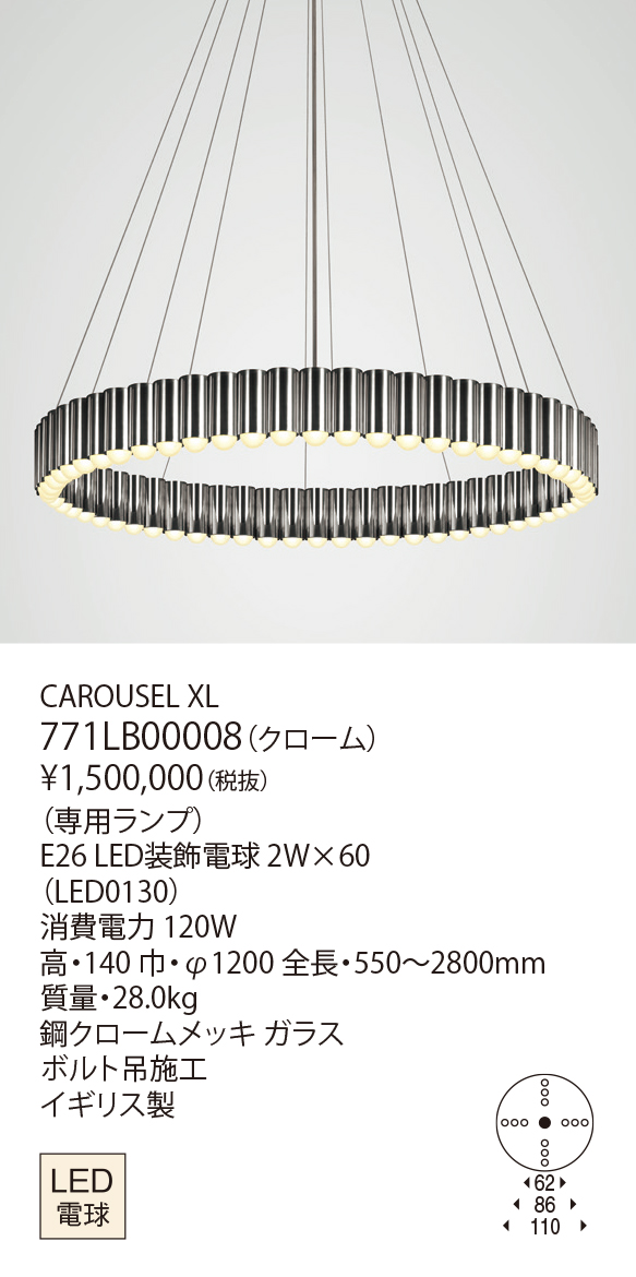 カルーセルは、英国でよくみられる移動遊園地のメリーゴーランドの形状からヒントを得てデザインされました。重厚感があり、空間に存在感を放ちながらも、上質でモダンな印象に変えるシャンデリアです。