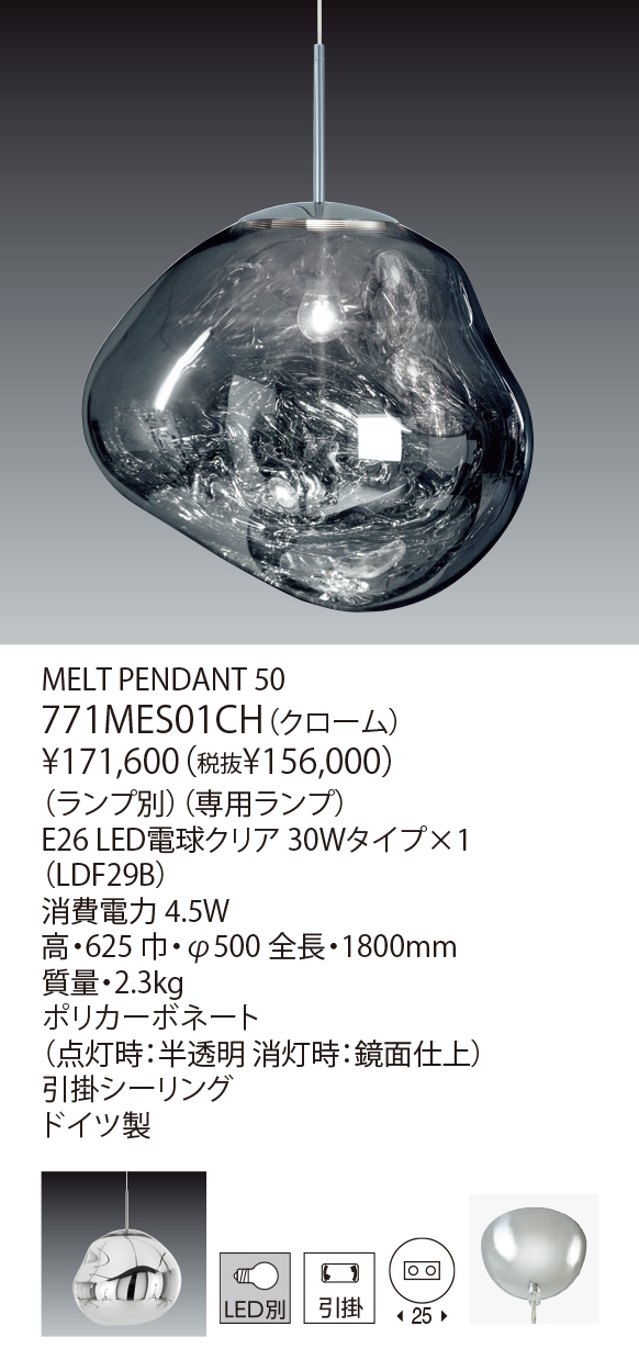 スウェーデンのデザイングループ「FRONT」とのコラボレートにより生まれたメルトは、Tom Dixonの代表作の一つでもある「COPPER」に「ひねり」を加えた吹きガラスのような形状が特徴的なポリカーボネート製の照明です。消灯時は鏡面状に見える金属のような塊が、点灯するとまるで固体が溶け出し液体状に変化しているかのような錯覚を与え、独特な光を放ちます。