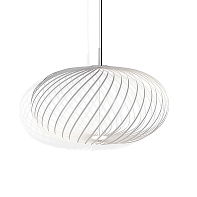 スピログラフで描いた図形を立体成型したようなフォルムが特徴のスプリング。リボン状のステンレスで構成されたシェードは好みにより高さを変えることが可能です。直径のバリエーションに加え高さの変化を付けることで、多灯の際、空間にリズムが生まれます。