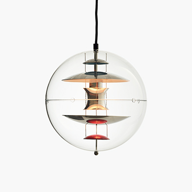 1969年、ヴァーナー・パントンによってデザインされた「VP グローブ」は、その圧倒的な存在感からスペースエイジ・デザインのアイコンとして特に人気の高い作品の一つです。透明なアクリルで包み込まれた5つのアルミ製のリフレクターは、内側をブルー、オレンジそしてホワイトに塗られ光を美しく制御します。
