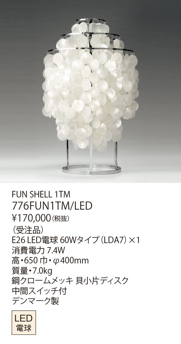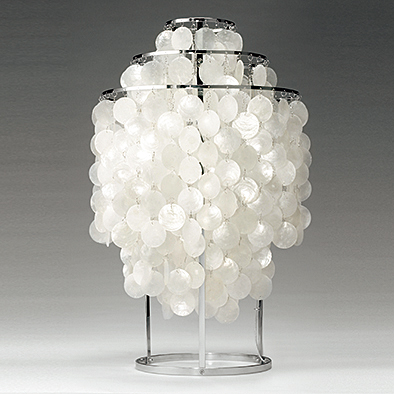 ファンシリーズは1964年にメタルタイプが先にデザインされています。丸いメタルの集合体は光と色を反射して豊かな色彩を生み出し、1950〜70年代に流行した近未来をほうふつとさせるスペースエイジ・デザインを代表する作品のひとつになっています。シェルタイプはパントンの新たな取り組みの中でシリーズに追加されましたが、透過する光はやさしく、風に揺れると繊細な音を奏でてくれます。ファンシリーズは、ペンダント、スタンド、素材、サイズなどが揃い、多様な空間を演出します。