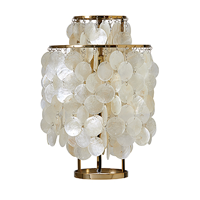 ファンシリーズは1964年にメタルタイプが先にデザインされています。丸いメタルの集合体は光と色を反射して豊かな色彩を生み出し、1950〜70年代に流行した近未来をほうふつとさせるスペースエイジ・デザインを代表する作品のひとつになっています。シェルタイプはパントンの新たな取り組みの中でシリーズに追加されましたが、透過する光はやさしく、風に揺れると繊細な音を奏でてくれます。ファンシリーズは、ペンダント、スタンド、素材、サイズなどが揃い、多様な空間を演出します。