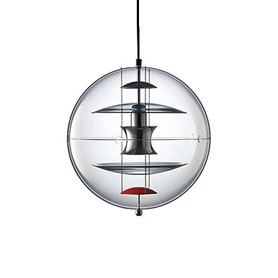 1969年にデザインされ、圧倒的な存在感の「VP グローブ」は、スペースエイジ・デザインを象徴する作品として、パントン作品の中でも特に人気の高い作品の一つ。透明なアクリルで包み込まれた5つのアルミ製のリフレクターは、内側をブルー、オレンジそしてホワイトに塗られ、光を美しく制御します。バリエーションの一つ「VPグローブカラードグラス」は大きいリフレクター2枚にスモークガラスを用い、よりクールな光を放ちます。