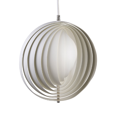 1960年にデザインされた「ムーン」は、中央の支柱を中心にサイズの異なるスチール製リングをまわして少しずつ位置をずらしていくことで、シェル状のシェードを形成。美しい光の陰影が楽しめます。