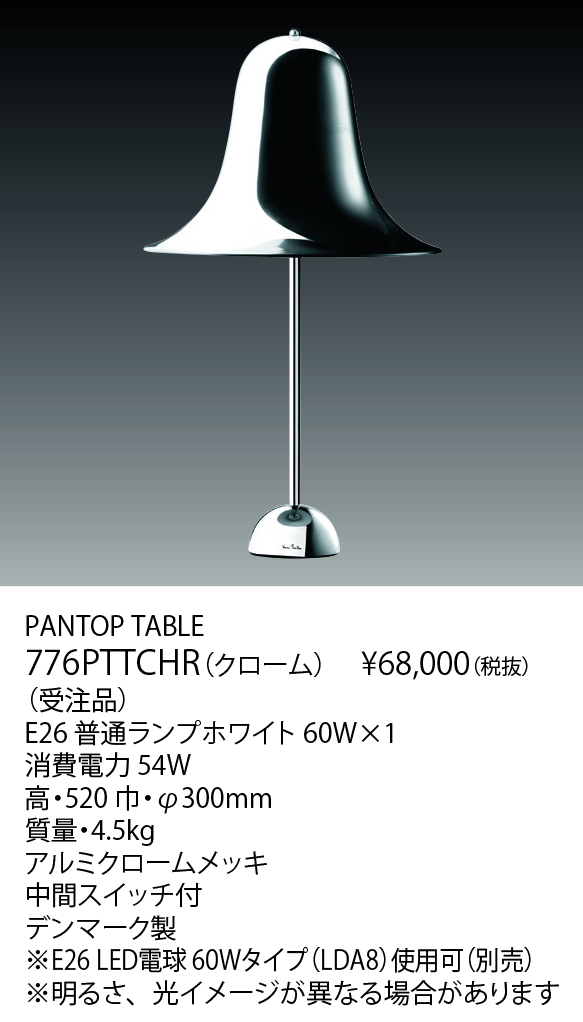 PANTOP TABLE(生産完了品) 776PTTCHR オープン価格 生産完了品 Main Spec Download データダウンロード チェックしたファイルをダウンロードします。 チェック全てをダウンロード 全て選択 小組画像 仕様図 取扱説明書 姿図1 姿図2 配光データ IESデータ 商品画像 3D CAD REVITデータ