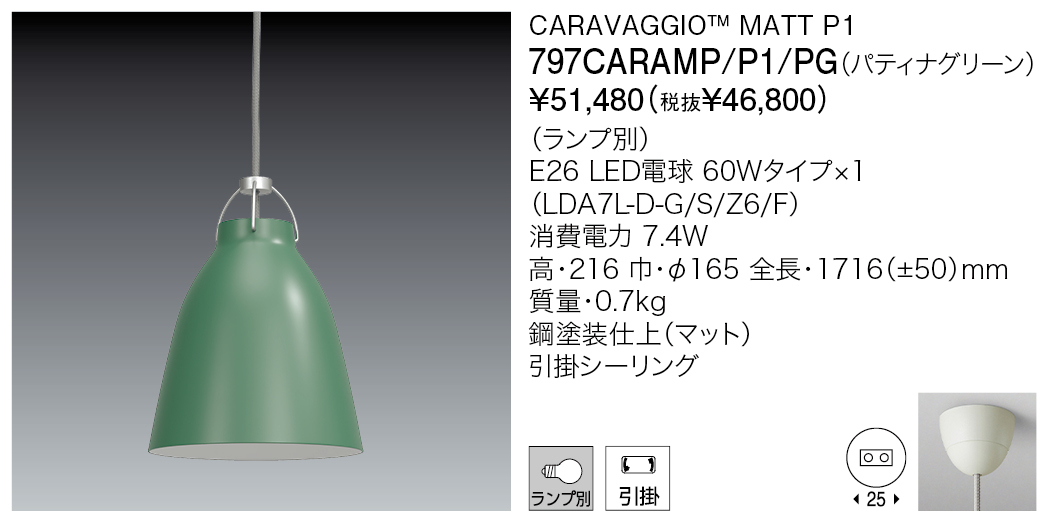 カラヴァッジオは、2005年の発表を経てデザインアイコンになりました。シンプルなカラヴァッジオは、やわらかくフェミニンなフォルムのシェードとは対照的に、ホルダー部分は男性的なデザインになっています。またテキスタイルケーブルは、デザインの大事な要素となっています。下方面への光と同時にシェード上部の開放部から漏れる光は、サスペンションとケーブルの表情を引き立てます。シェード内部の光源を高めに設定したことによりグレアフリーな仕様に仕上げました。