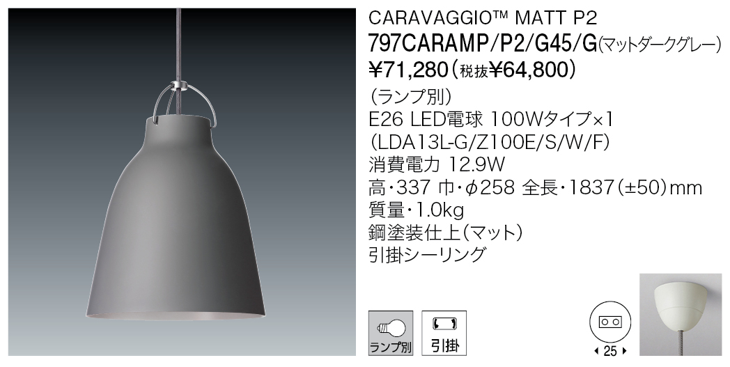 カラヴァッジオは、2005年の発表を経てデザインアイコンになりました。シンプルなカラヴァッジオは、やわらかくフェミニンなフォルムのシェードとは対照的に、ホルダー部分は男性的なデザインになっています。またテキスタイルケーブルは、デザインの大事な要素となっています。下方面への光と同時にシェード上部の開放部から漏れる光は、サスペンションとケーブルの表情を引き立てます。シェード内部の光源を高めに設定したことによりグレアフリーな仕様に仕上げました。
