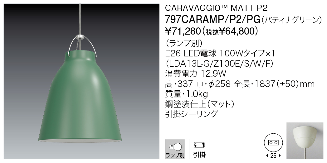 カラヴァッジオは、2005年の発表を経てデザインアイコンになりました。シンプルなカラヴァッジオは、やわらかくフェミニンなフォルムのシェードとは対照的に、ホルダー部分は男性的なデザインになっています。またテキスタイルケーブルは、デザインの大事な要素となっています。下方面への光と同時にシェード上部の開放部から漏れる光は、サスペンションとケーブルの表情を引き立てます。シェード内部の光源を高めに設定したことによりグレアフリーな仕様に仕上げました。