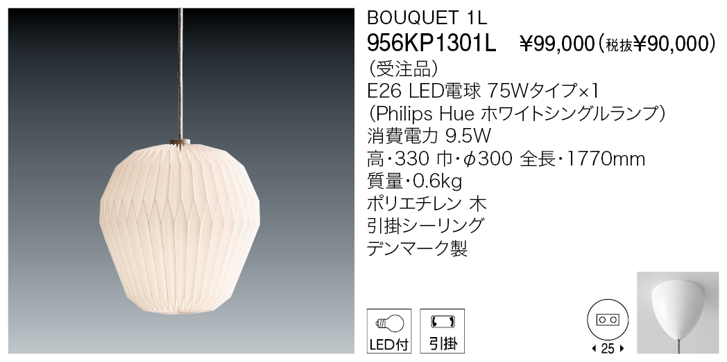ブーケは、イタリアの街角にある花屋で見かけた無造作に束ねられたチューリップの姿をヒントに生まれました。シェードに合わせるのは、素材感のあるリネン製のコードやオーク材のパーツ。優しさを感じるデザインです。