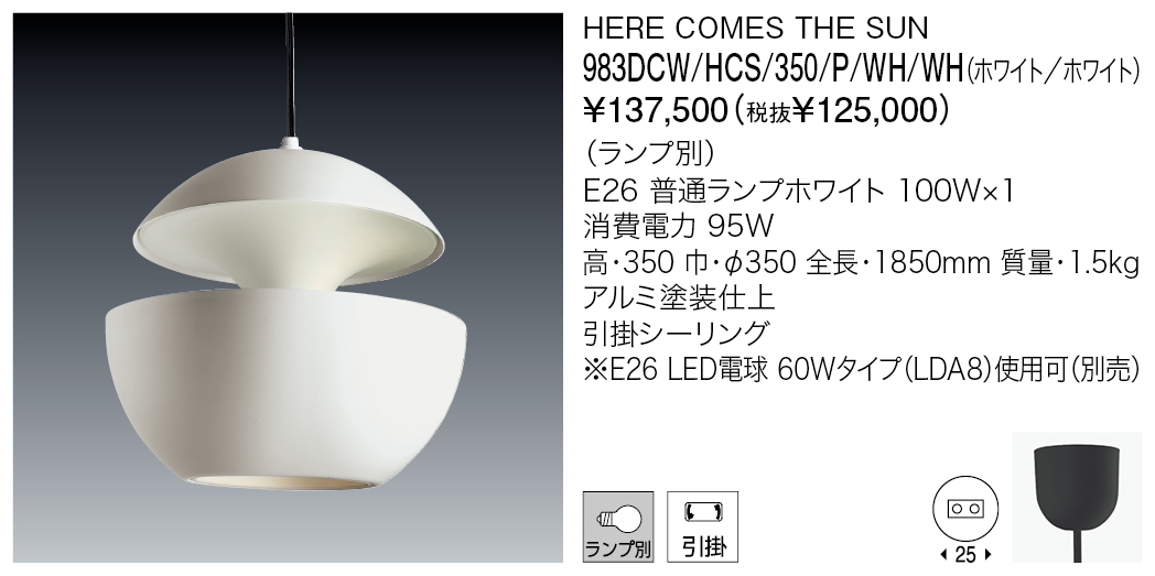 ヒア・カムズ・ザ・サンは、フランスの著名な建築家ベルトラン・バラスが、1970年に発表しました。魔法のような光を放つアルミ製の球形のシェードは、見る人の気分によって、日の出や日中の太陽、さらには月の光のようにも感じられます。現在でもフランスの多くの人々に支持されているペンダント照明です。