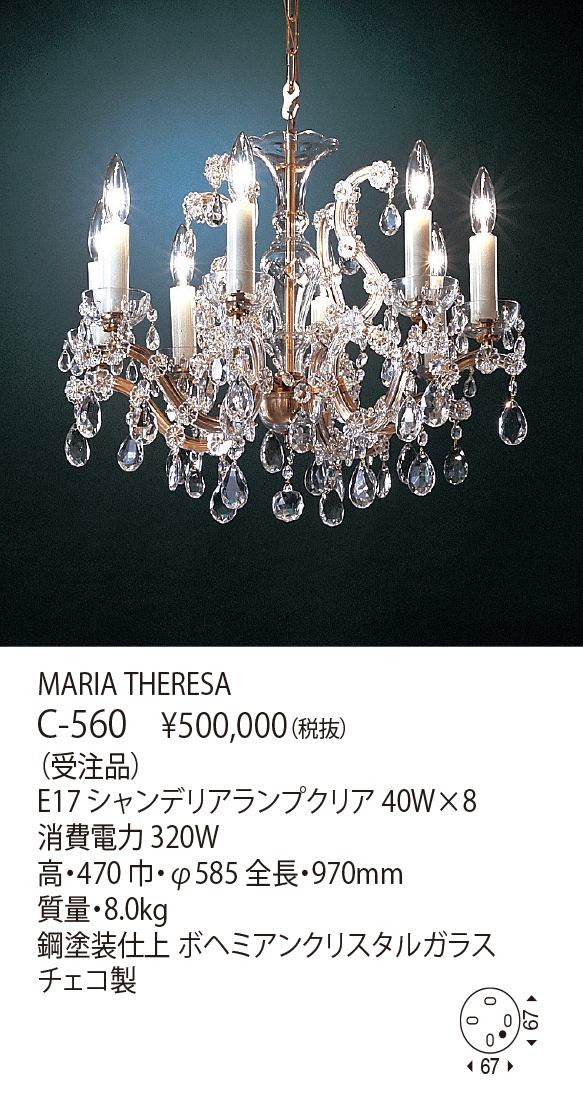 マリア・テレジアはダイヤモンドのような精微なカッティングで知られるボヘミアン・クリスタルガラスが優雅な光のシンフォニーを奏でる、最も豪華で正統的なシャンデリアです。その名は1740年、オーストリアの女帝マリア・テレジアがシェーンブルン宮殿のために古くからガラス工芸で有名なボヘミア地方の職人に命じて造らせたシャンデリアに由来します。澄みきった硬質な透明感を持つクリスタルガラスで金属アームを覆い、その両端を花を模したガラスの飾りで留めるという手の込んだ技法のマリア・テレジア型シャンデリアは、パリのヴェルサイユ宮殿にも使われて、確固たる名声を不動のものとしました。