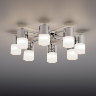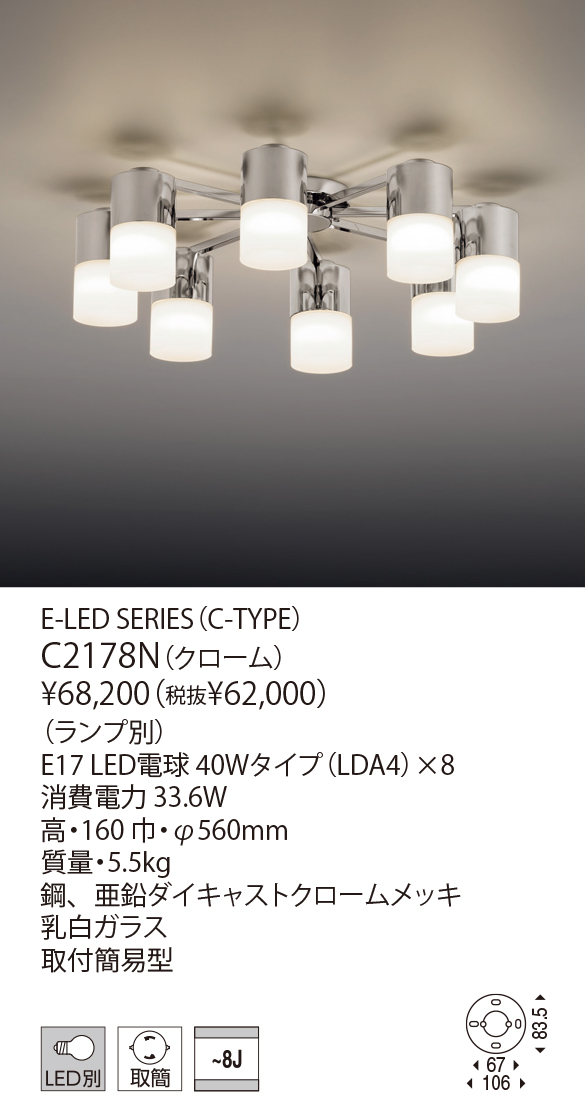 E-LEDシリーズは、EベースのLED電球に対応した住宅用のシャンデリアシリーズです。C-TYPEの乳白色のシリンダー状のガラスシェードは、光をやさしく拡散します。