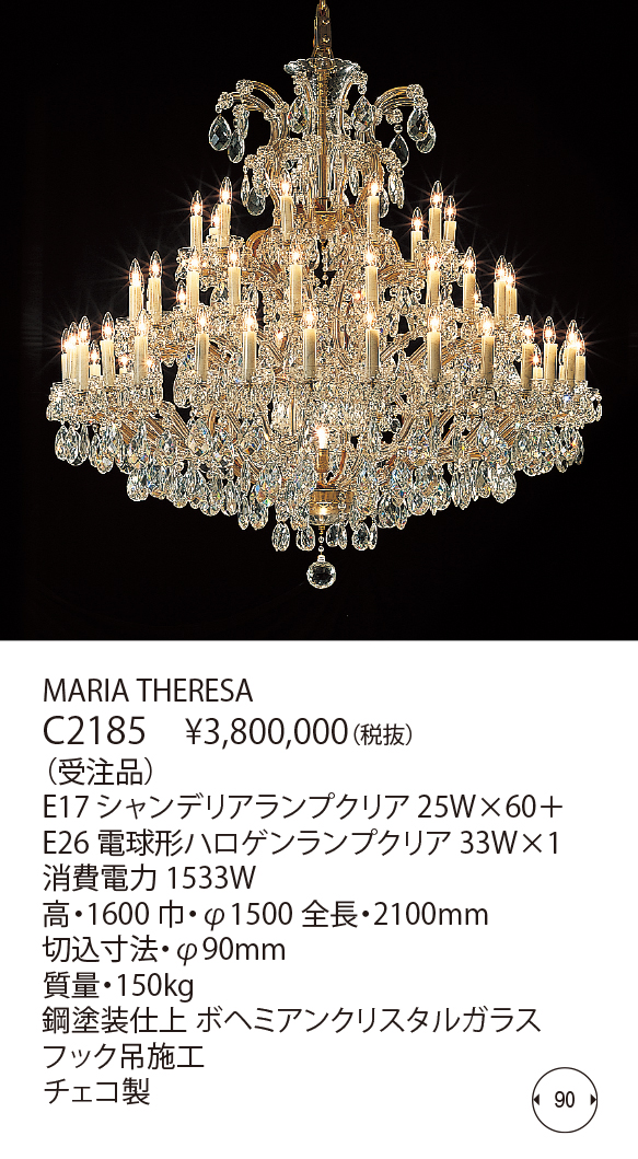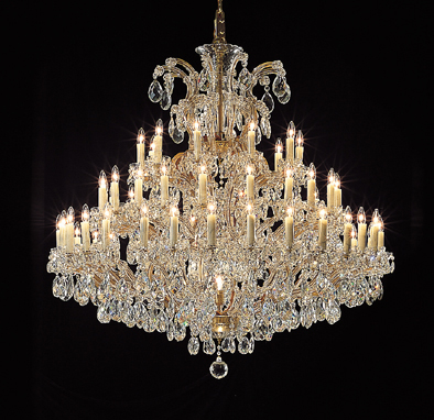 マリア・テレジアはダイヤモンドのような精微なカッティングで知られるボヘミアン・クリスタルガラスが優雅な光のシンフォニーを奏でる、最も豪華で正統的なシャンデリアです。その名は1740年、オーストリアの女帝マリア・テレジアがシェーンブルン宮殿のために古くからガラス工芸で有名なボヘミア地方の職人に命じて造らせたシャンデリアに由来します。澄みきった硬質な透明感を持つクリスタルガラスで金属アームを覆い、その両端を花を模したガラスの飾りで留めるという手の込んだ技法のマリア・テレジア型シャンデリアは、パリのヴェルサイユ宮殿にも使われて、確固たる名声を不動のものとしました。