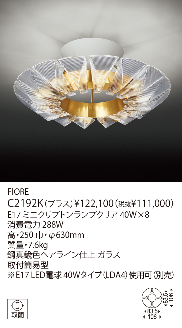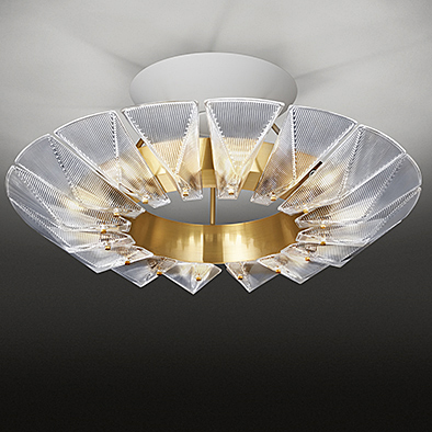 フィオーレは、内側にプリズムカットしたクリアのプレスガラスをリング状に並べたデザインが特徴です。折り紙のようなシャープなエッジラインが連続し、煌き感のあるモダンなシャンデリアです。