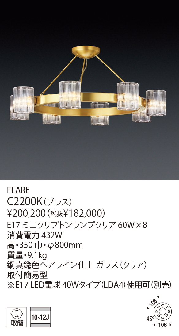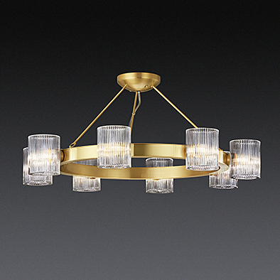 フレアは、10世紀頃に教会を中心として発達したクラシックシャンデリアの一つ、リングの周りに蝋燭を配したロマネスク様式をモダンに解釈したシャンデリア。独特の味わいがあるプレスガラス製のシェードを通る光は、空間に重厚な輝きを放ちます。クリアガラスとクローム仕上げの本体、内面白色のガラスとクロームメッキに一部白色塗装の2つのバリエーションを用意。インテリアのスタイルに合わせて選べます。