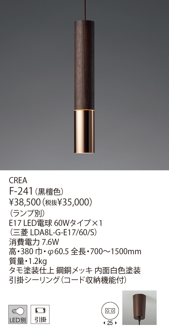 クレアは、木と金属、異なる素材の組み合わせにより形や素材の純粋さとミニマルさが際立つペンダントです。下方への十分な照度を確保すると共に、スリットからこぼれる光が空間へのアクセントになります。イタリア語で「創造」という意味を持ち、単体での使用だけでなく多灯で使用することで、さらに魅力的な空間を創り出します。